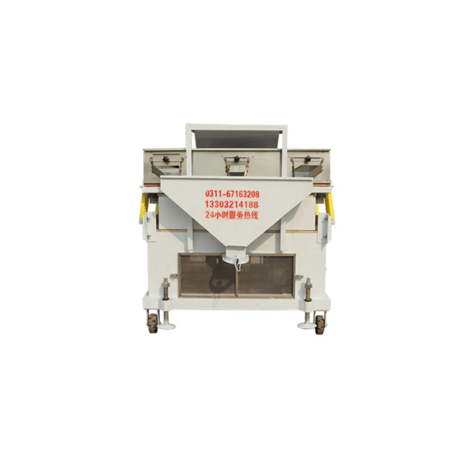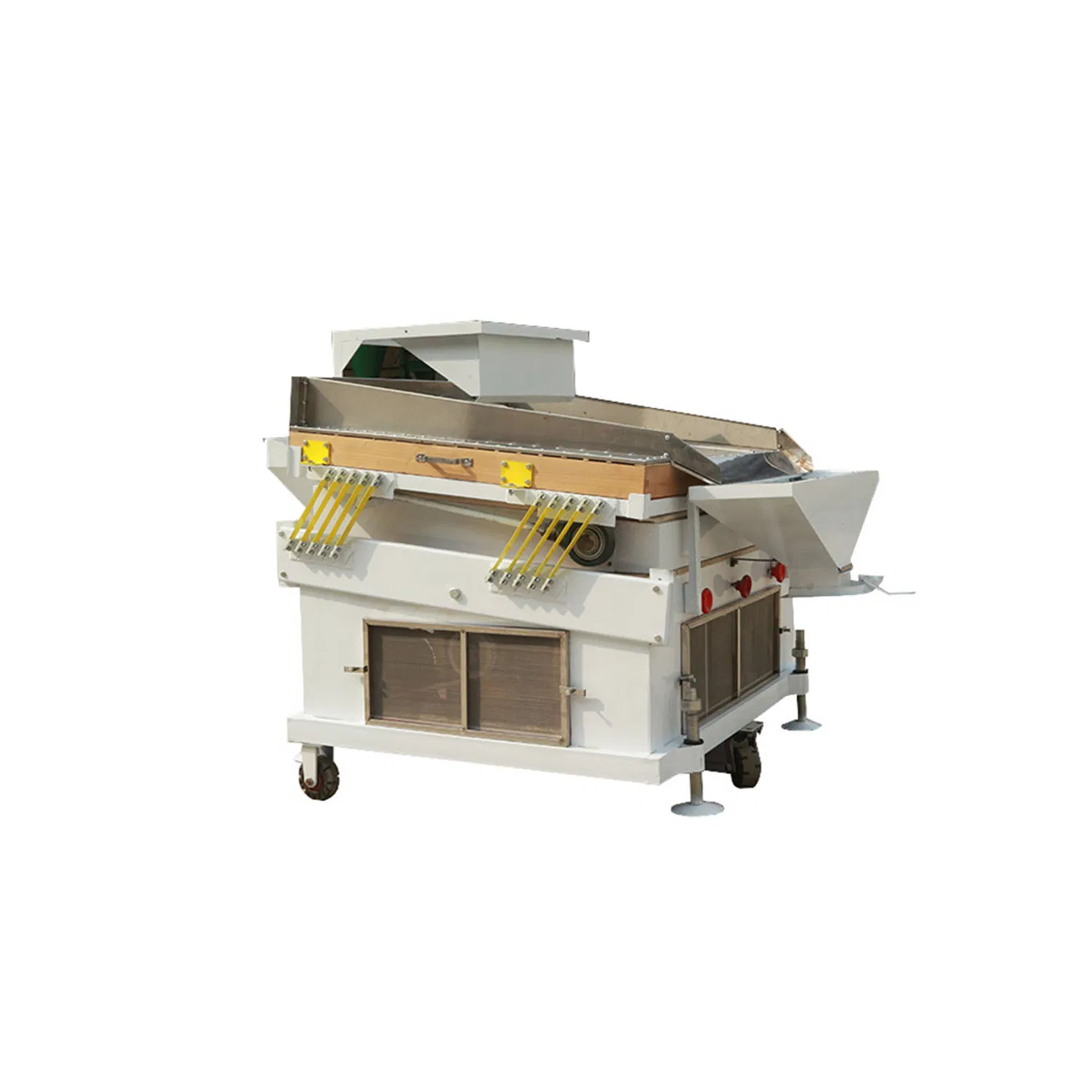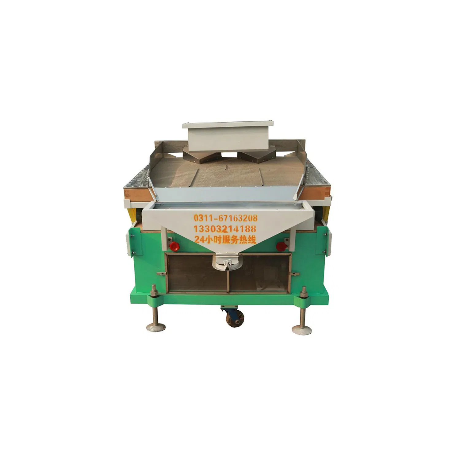 According to the difference of the density between the grain and sand , byadjusting the parameters such as wind pressure and amplitude, the stoneswith a high density ratio are moved from low to high on the sieve surface,and the grain with higher density are moved from high to low, thus achieving separation.