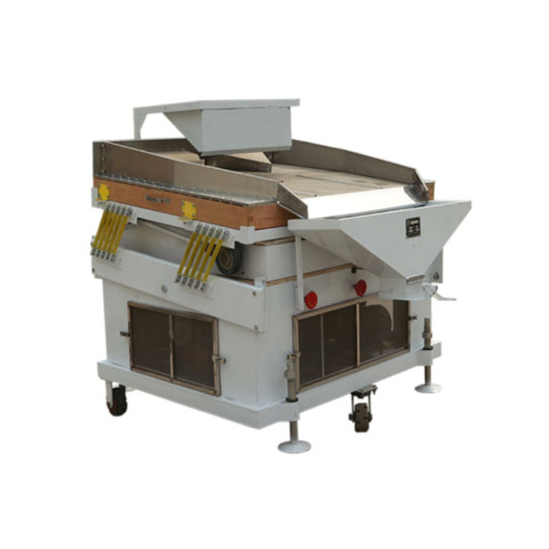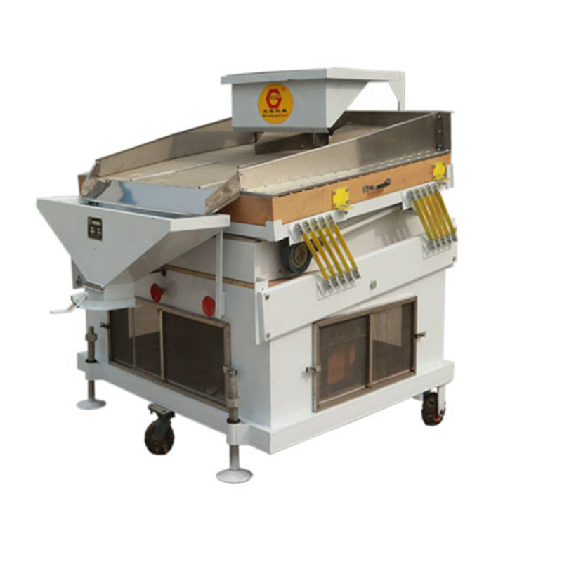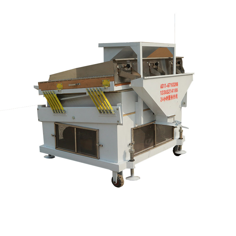 According to the difference of the density between the grain and sand , byadjusting the parameters such as wind pressure and amplitude, the stoneswith a high density ratio are moved from low to high on the sieve surface,and the grain with higher density are moved from high to low, thus achieving separation.