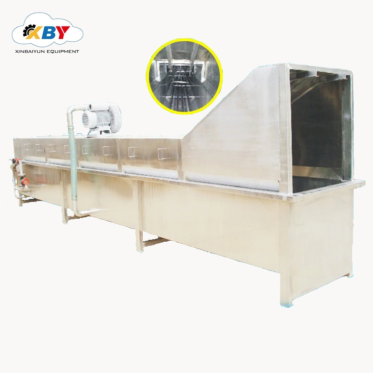 Air blowing scalder is applied in scalding procedure before poultry plucking, it is box shape construction, energy saving, using direct steam heating, water temperature and level is automati-cally controlled, air flow agitation, it can not only get perfect scalding performance but also meet different kinds of processing capacity requirement.