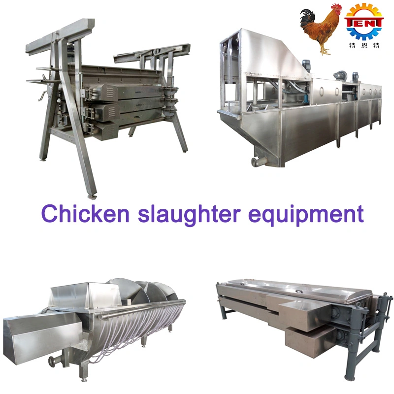 Production process of poultry slaughter equipment 1.hanging live chicken on the drain blood chain, butchering drain the blood. 2.the drain after the blood, the chain of hair chicken into the curved type scalding pool. 3.poultry carcass from curved scalding pool directly into Horizontal hair removal......