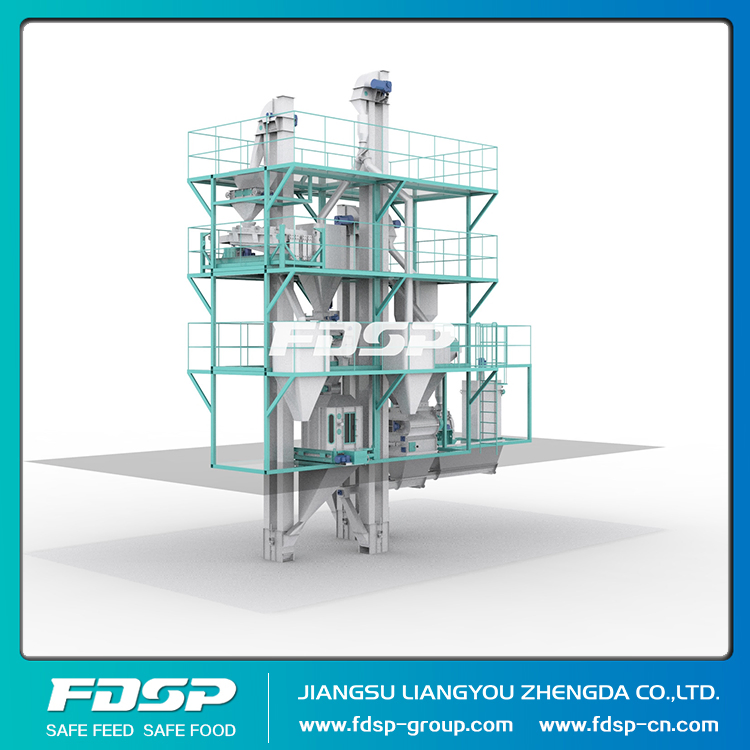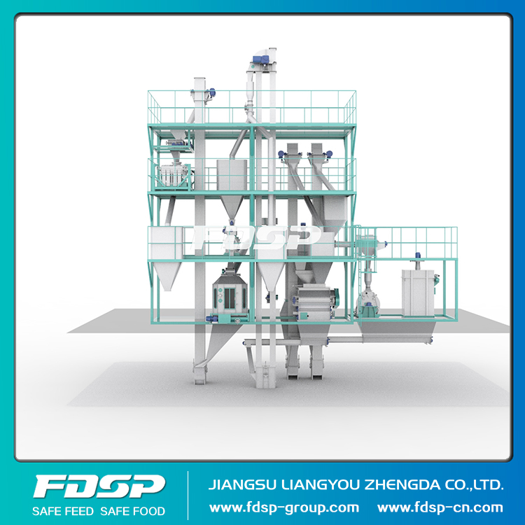 Technological characteristics and introductions:RM receiving and cleaning process:Granules and powder material will be put into the production line separately though two inlet, the granules will be screened and cleaned to remove impurities by pre-cleaner, then remove the iron before it go into the hammer mill, the powder material should be cleaned in advance.Grinding process: adopts FDSP's tear circle hammer mill which can make both coarse grinding and fine grinding, the feeder is combined together with the pre-cleaner which can clean the material and also feeding into the hammer mill, variable frequency control, evenly feeding and equipped with pulse filter. Mechanical induct discharging. The process is simple and with low cost, it is suitable for small capacity and multi type of material's grinding.Grinding machine: hammer mill SFSP568-Iwith power 22KW, output:2-3t/hMixing process:there is pre-mixing bin upper the mixer which can make the feeding continuously when mixer working, the mixed material can go into the pre-pelleting bin and mesh feed bins separately to meet the requirement for producing mesh feed and pellet feed at same time.Mixing equipment: double shaft paddle mixer SHSJ0.5 with 5.5kw, 250kg/P, homogeneity CV≤5%Pelletizing process: adopt one pellet mill with single conditioner which is suitable for normal poultry feed and ruminant feed production. the material go into the cooler directly after pellet mill, then go into the crumbling and screening system through bucket elevator, manual packing at last.Pelletizing equipment: pellet mill SZLH32 with 37kw, output:2-3t/h.( ¢3.5 normal broiler feed formula)Cooling equipment: counter flow cooler SKLN2.5 with output 3-4t/hCrumbler: SSLG15x80 with output 2-3t/h, it can crumble the large feed pellets into small pellets to produce small chicken grow seedling feed. the crumbler is designed with by pass system so the material can be go into the screener though by pass when no need to use crumbler.Screening equipment: plan rotary screener SFJH80×2C with capacity 4-6t/h