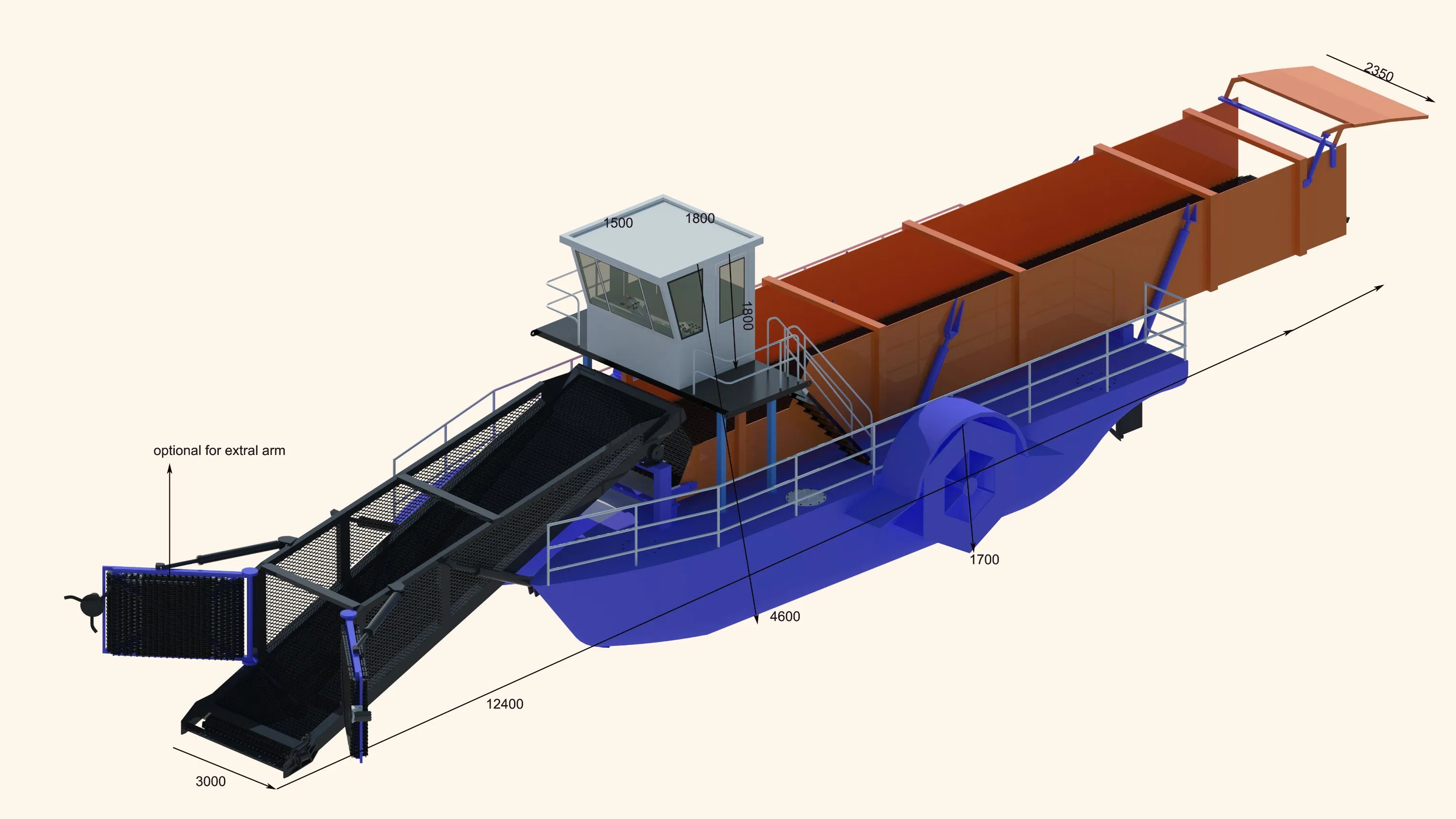 3) The carrying capacity of this vessel can be six tons, which shortens the unloading times and fuel consump-tion. IN the river with much water hyacinth, it only needs eight minutes to full load the vessel. After full loaded, the vessel will unload the salvaged material on the river bank or trucks by rear cabin lift system.