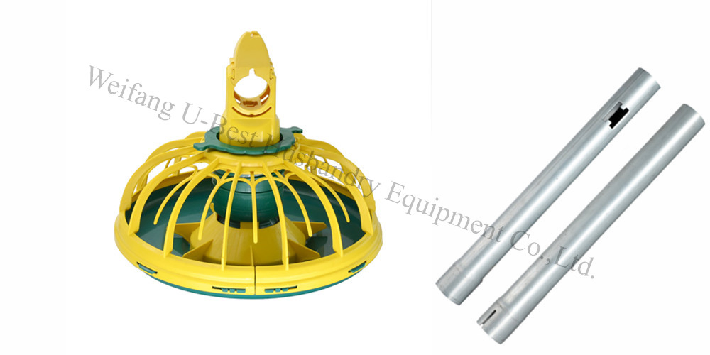 | Advantages | a. Different gears of feed amount, meeting eating demands of different period chickens. b. Accurate and quick to adjust feed flow, the principle is to catch two ears in the inner and pull them out adjust up and down. c. The pan bottom can be disassembled on the ground, which can be used for day-old chicks. d. V-shape plate design can reduce feed storage on bottom, so birds can always eat fresh feed, which also prevents birds staying on the plate for a long time. e. The edge of pan plate tilt towards the center, which avoids waste of feed, the smooth edge prevents birds craws hurting and make sure safe and comfort feeding. |